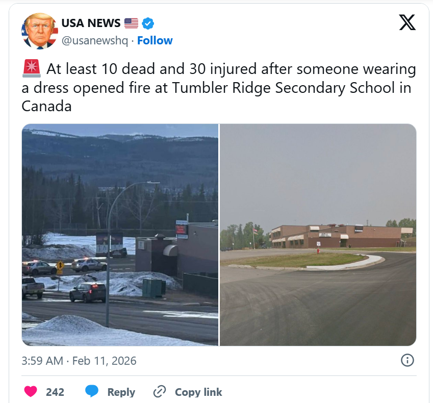 ”I am devastated by today’s horrific shootings in Tumbler Ridge, B.C. My prayers and deepest condolences are with the families and friends who have lost loved ones to these horrific acts of violence.”