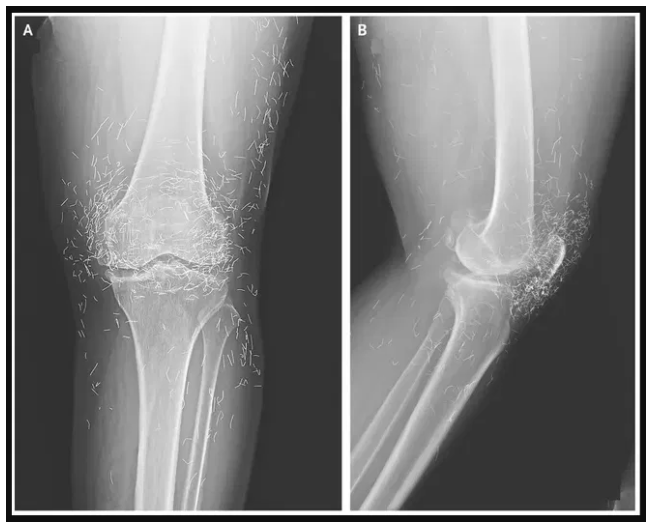 As doctors examined an X-ray image of the knees of an old woman experiencing severe joint pain, they found a gold mine: hundreds of tiny gold acupuncture needles left in her tissue.
